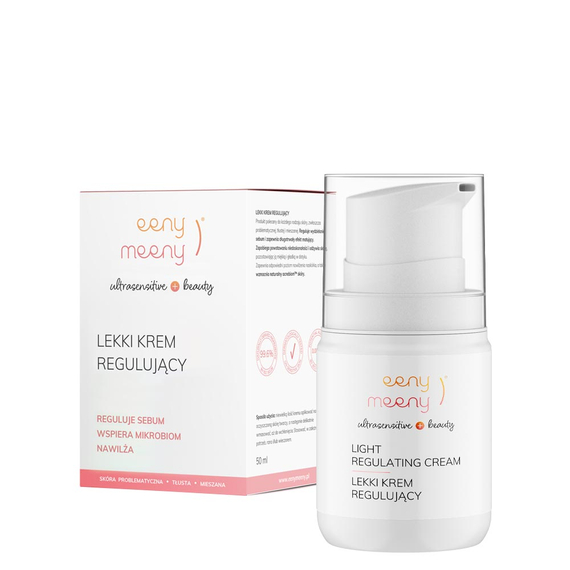 - Lekki krem nawilżający regulujący eeny meeny, poj. 50 ml, polecany do każdego rodzaju skóry, zwłaszcza problematycznej, tłustej i mieszanej, ze skłonnością do zanieczyszczeń i nadmiernego przetłuszczania.